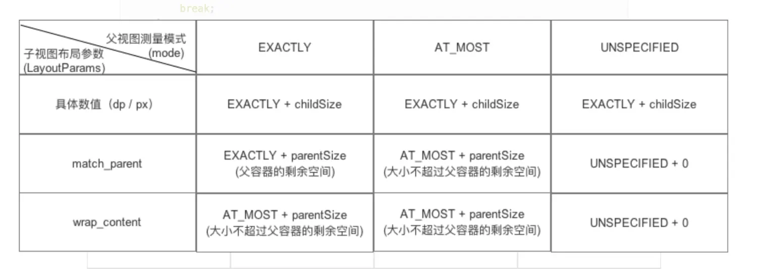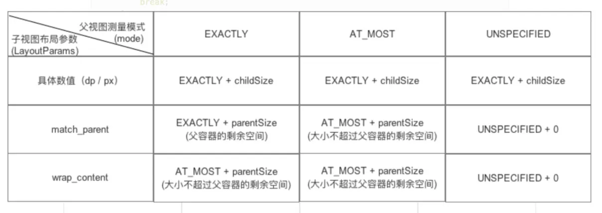 - 别担心,我已经帮大家总结好。具体子View的测量模式和大小请看下表: