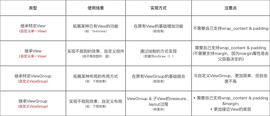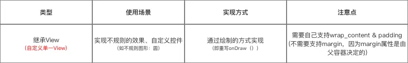 对于自定义View的类型介绍及使用场景如下图: