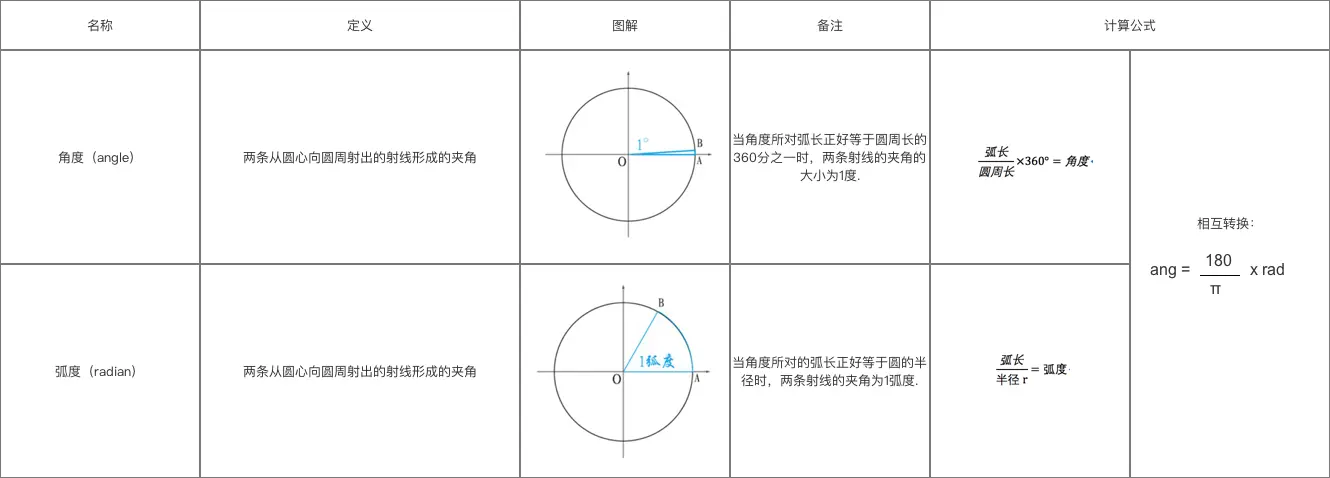 - 角度和弧度都是描述角的一种度量单位,区别如下图::