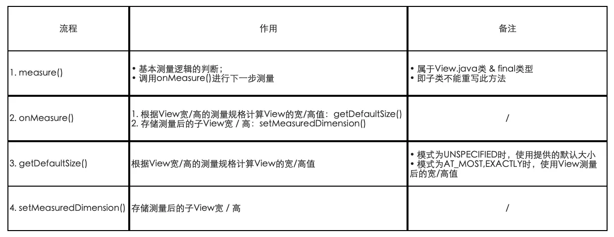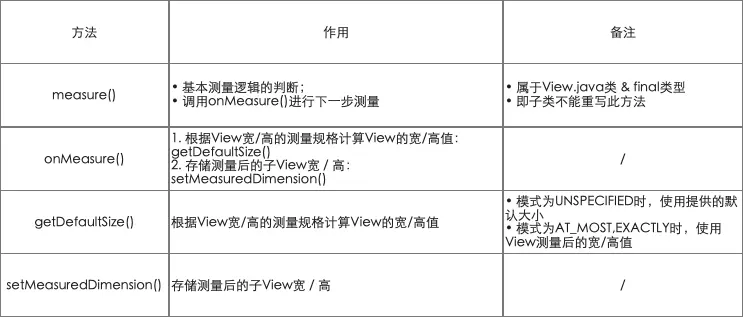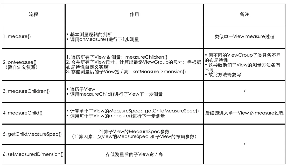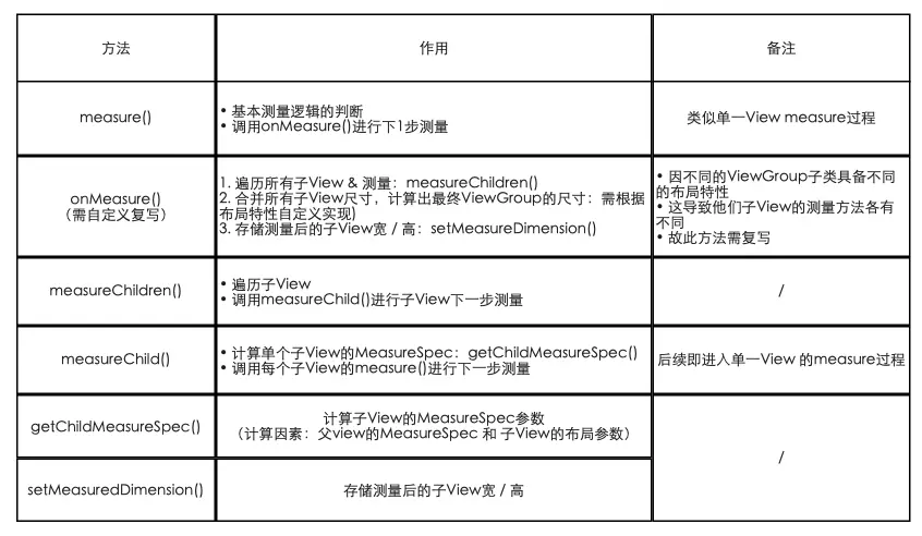 对于视图组ViewGroup的测量流程(Measure)各个方法说明总结如下所示。