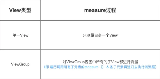 - 二者最大的区别在于:单一View的measure过程对onMeasure()有作统一实现,而ViewGroup的Measuer过程没有;