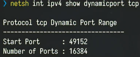 | 2 | netsh int ipv6 set dynamic tcp start=49152 num=16384 |