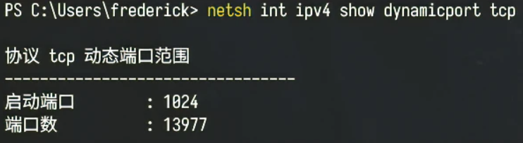 使用命令 netsh int ipv4 show dynamicport tcp 可以查看目前「TCP 动态端口」的范围,如图所示。
