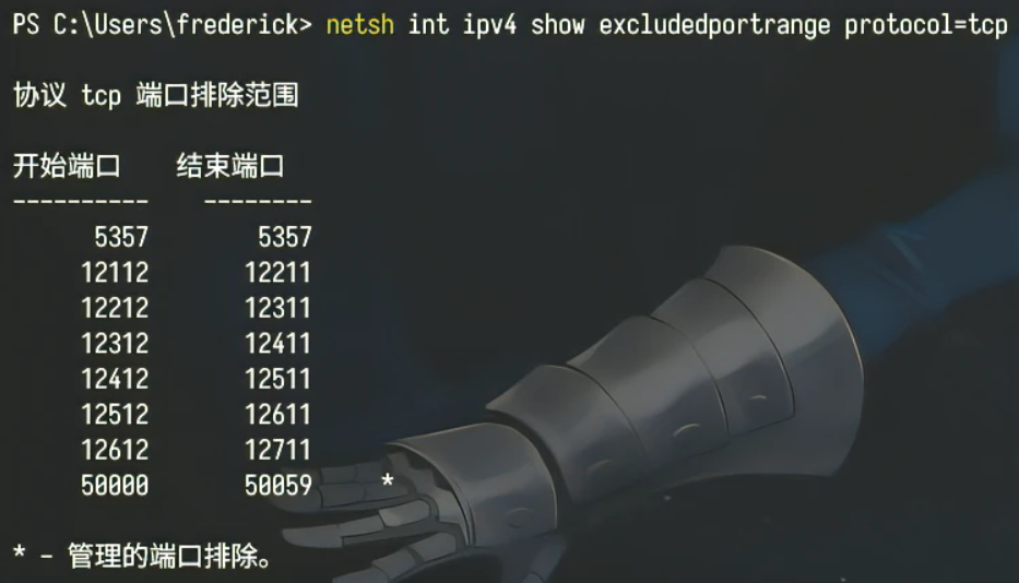 这只是一个「待选择」范围,并不代表其中的所有端口都会被保留,只是有一部分会被 Hyper-V 征用。使用 netsh int ipv4 show excludedportrange protocol=tcp 命令可以查看当前所有已经被征用了的端口,如图 2 所示。
